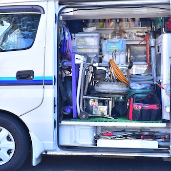 給排水設備のあらゆるトラブルに対応できるようにリストアップされた各種パーツ、器具、配管材料、工具類を車載しています。